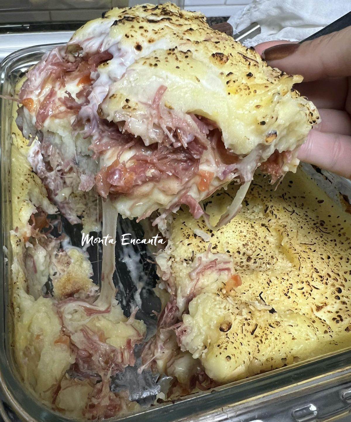 Cadê? Tá escondidinho. A piada não tem graça, mas o escondidinho tem uma camada secreta de recheio, envolta em um purê de batata com manteiga e, para gratinar, queijo mussarela. Um prato econômico que entrega muito sabor. É de comer sorrindo e repetir.
