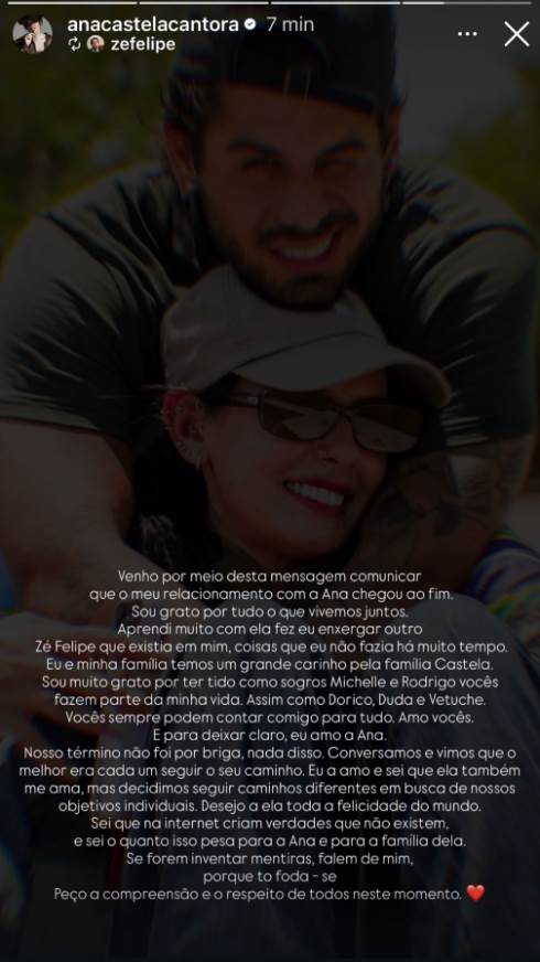 Nesta segunda-feira, 29, os cantores Ana Castela e Zé Felipe surpreenderam os fãs ao anunciarem o fim do relacionamento. A famosa Boiadeira confirmou o término após o sertanejo compartilhar a notícia nas redes sociais. O ex-casal estava junto desde outubro deste ano.