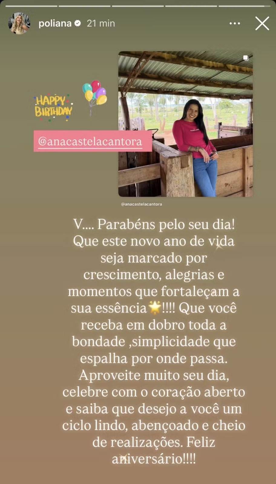 A cantora Ana Castela está completando 22 anos neste domingo (16), e já recebeu muitas felicitações por meio das redes sociais, entre elas, do namorado Zé Felipe, e da sogra Poliana Rocha. Mas a declaração da jornalista chamou atenção pois além de destacar a simplicidade e energia da boiadeira, ela cometeu algo que, aparentemente, seria uma gafe.