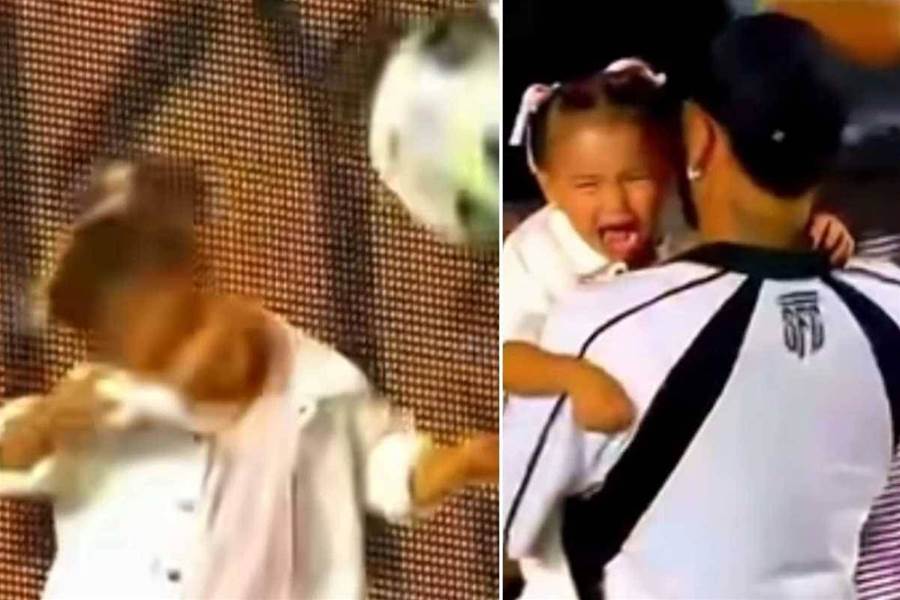 Mavie, a filha do famoso jogador, estava acompanhando seu pai no gramado, desfrutando do ambiente animado que precede os jogos de futebol. Ela foi pega de surpresa quando uma bola, lançada por um dos jogadores, atingiu a parte de trás de sua cabeça.