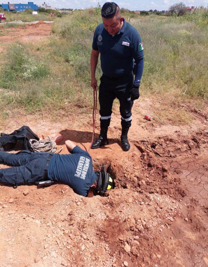 Os Bombeiros Guadalupe, em Zacatecas, México, atenderam ao chamado de um vizinho e salvaram este canino que permaneceu neste buraco de 4 metros de profundidade.